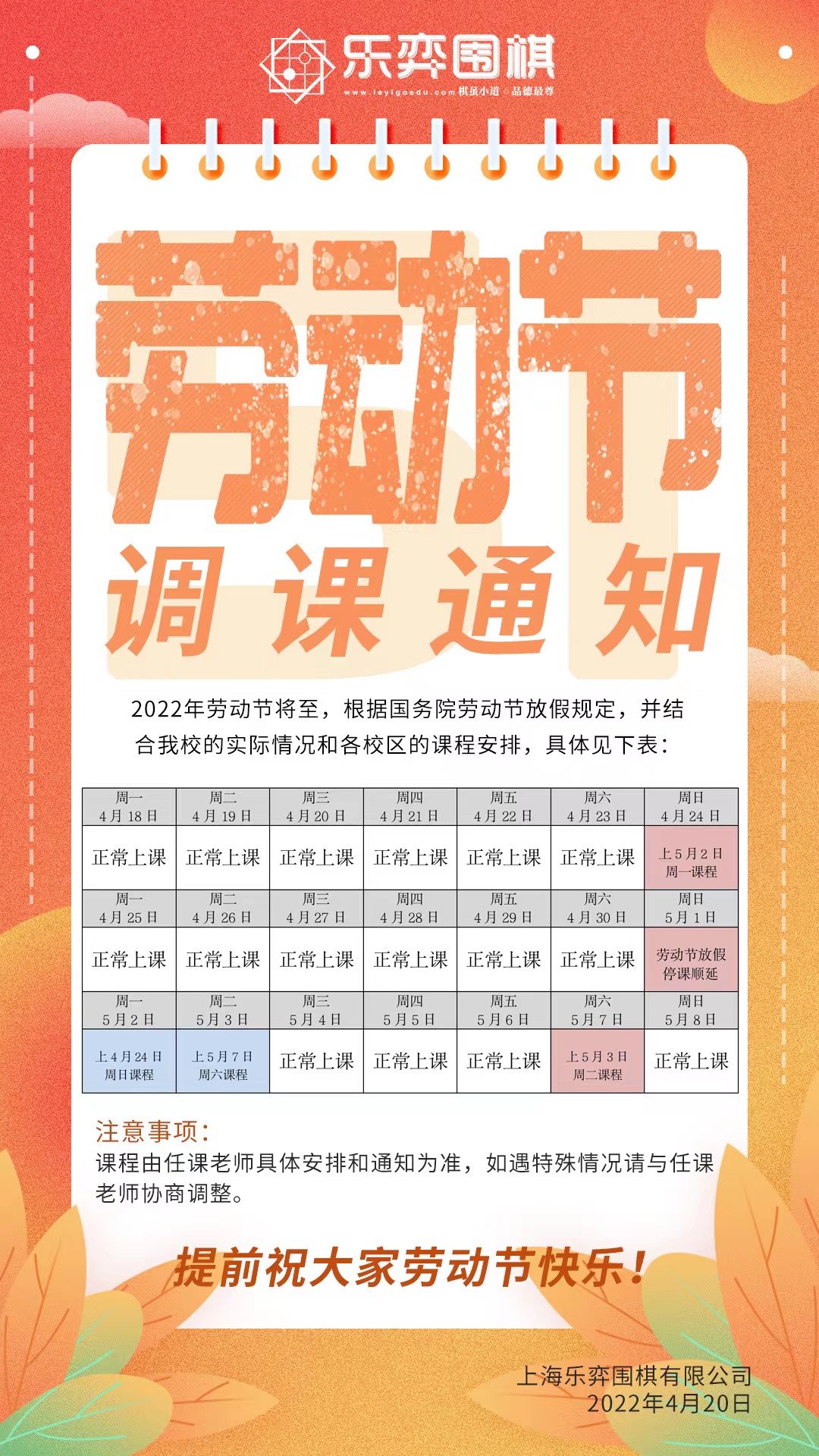 亲爱的家长朋友们: 您好!春回大地,柳绿红花,在徐徐春风里,我们即将迎来2022年五一劳动节。根据国务院劳动节放假规定,并结合我校的实际情况和各校区的课程安排现将劳...